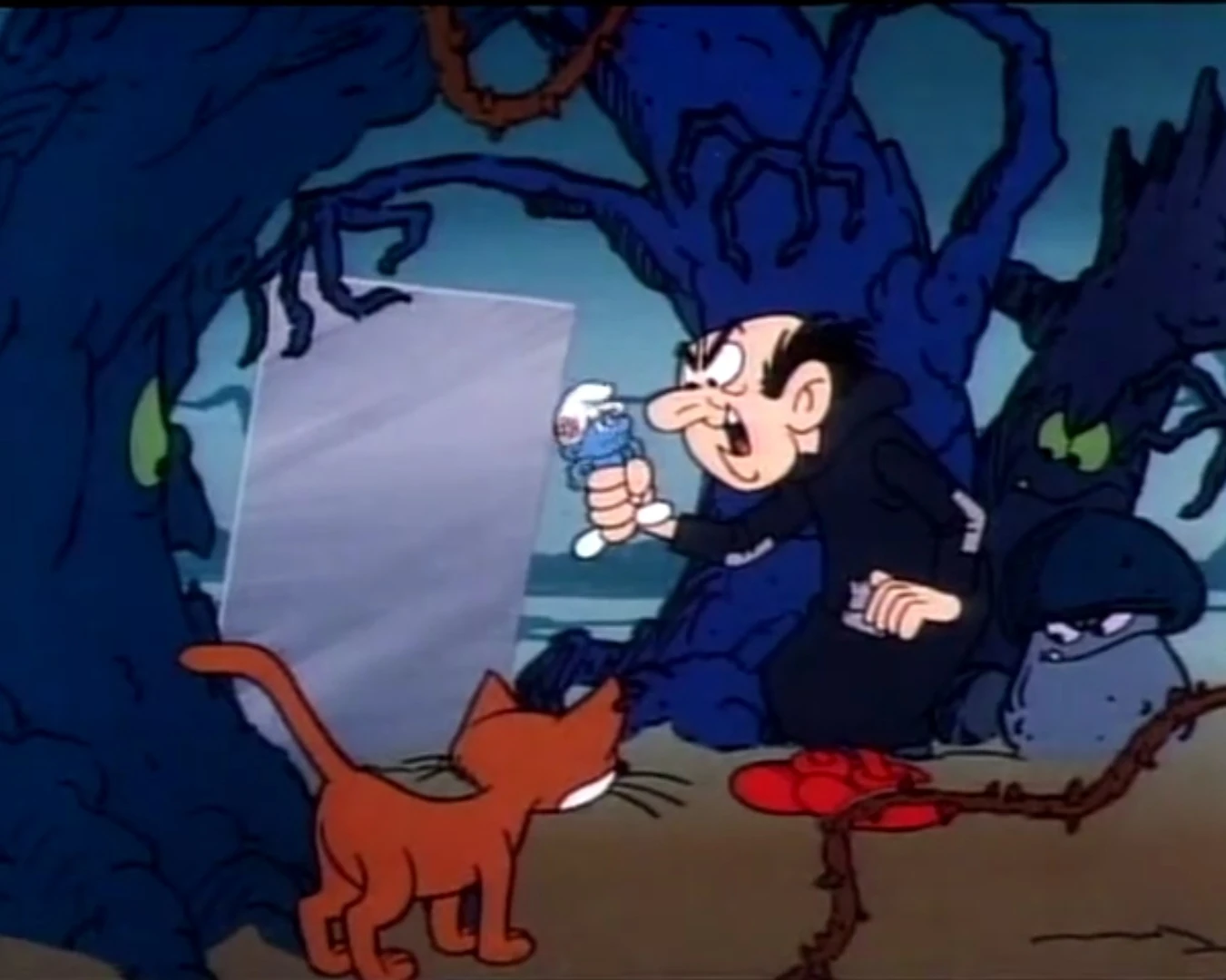 Within the scary realm of the mirror, Smurfette and Brainy call out for Clumsy, whom they find hiding behind a rock. They start running when Smurfette sees a giant tree coming after them, only to run into Azrael, who was only briefly awakened when they bumped into him. As the three Smurfs fearfully back away, they see Gargamel holding Vanity, preparing to put him in the stew pot. The evil wizard takes a whiff of the simmering contents before his nose also picks up the scent of more Smurfs. He tells Azrael to get ready, but then Vanity slips out of Gargamel's grasp and punches him in the nose before making a run for it. He joins the other three Smurfs in trying to escape the terrible twosome, but there's no way for them to leave the dark realm of the mirror. They find themselves trapped between the entrance and their pursuers. Gargamel tells Azrael to stand back as he pulls out a club to smash the Smurfs with it. Instead, he misses them and ends up breaking the glass of the mirror entrance, opening a small crack for the Smurfs to escape through.