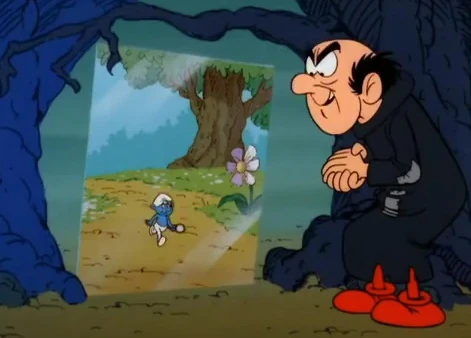 Papa Smurf finds the four Smurfs escaping the mirror in the forest, glad that he has found them. Vanity warns the others that it's Gargamel and that they should run for it. Inside the mirror, Gargamel is looking for where his prey went before he is transported back outside with his magical mirror in ruins. Frustrated by his loss, Gargamel pounds his head on a tree, saying that he hates the Smurfs, while Azrael does the same.