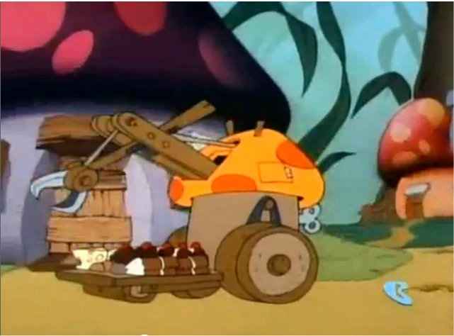 By morning, Handy is ready to unveil his latest labor of love: a "smurfomatic food processing complex" which will make food preparation much easier. To demonstrate how it works, Handy turns the key that gets the machine going, and soon the picking machine docks itself onto a platform which is then raised up to a funnel where it dumps its load of smurfberries. Shortly after, another automatic machine comes out of the food processor to deliver various prepared foods right on the doorstep of every Smurf's house! Every Smurf cheer at this new second invention, and Papa Smurf couldn't help heaping praise on Handy, who then says that from now on they will never have to work for their food again.
