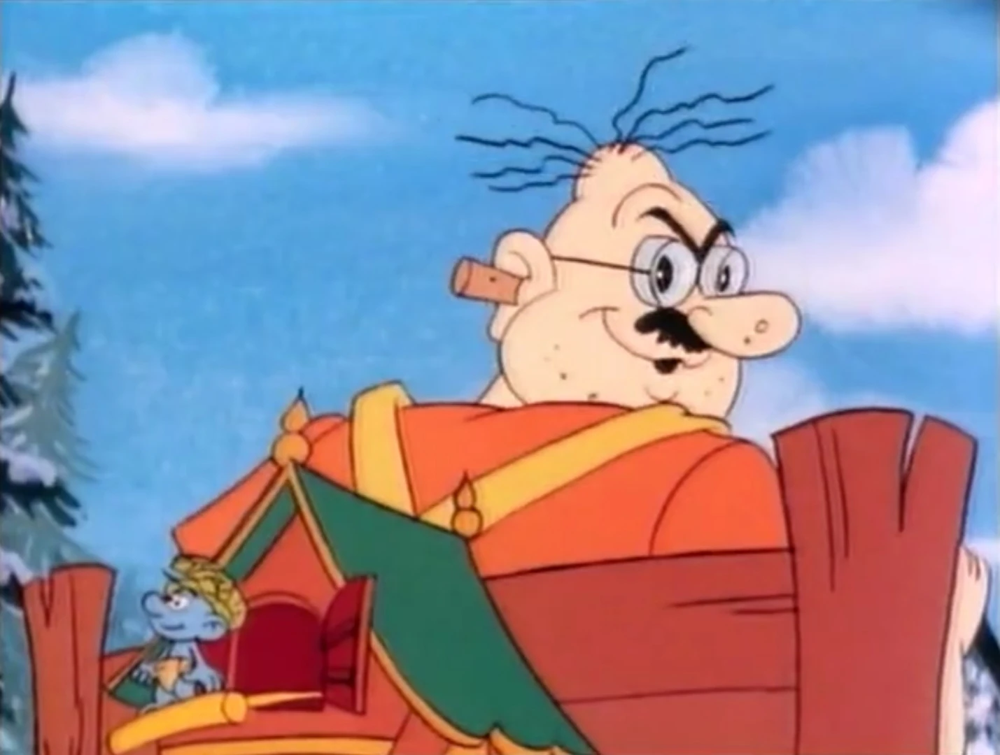 Meanwhile, the chocolate thief drives along the snowy road on a wagon pulled by his horse, and they bump into a stone on the road. The cuckoo clock and the roll of cheese with Wild fly out of the wagon, and Wild is unstuck from the cheese. Wild notices the frozen cuckoo on the cuckoo clock and tries to tell it to fly away. As it doesn't work, he attempts to pull her off. Meanwhile, the Smurfs are getting closer to the wagon. Wild struggles to pull off the cuckoo, so he bumps into it, and it flies off, thankful to Wild. The chocolate thief notices this and grabs Wild, frustrated that he has ruined the clock. The Smurfs arrive just to see the man using Wild as a replacement for the cuckoo. As they're watching, Brainy and Clumsy bump into them, but they quickly get up and run towards Wild. The chocolate thief notices them and tries the clock again, and the time is stopped for the Smurfs, so he gets away. The Smurfs are unfrozen when he leaves and Papa Smurf discovers that the clock has the ability to stop the time. Painter points out that the cheese skis have been destroyed in a crash, but Greedy has a solution - a wide slice of cheese that they use as a sleigh and follow the tracks.