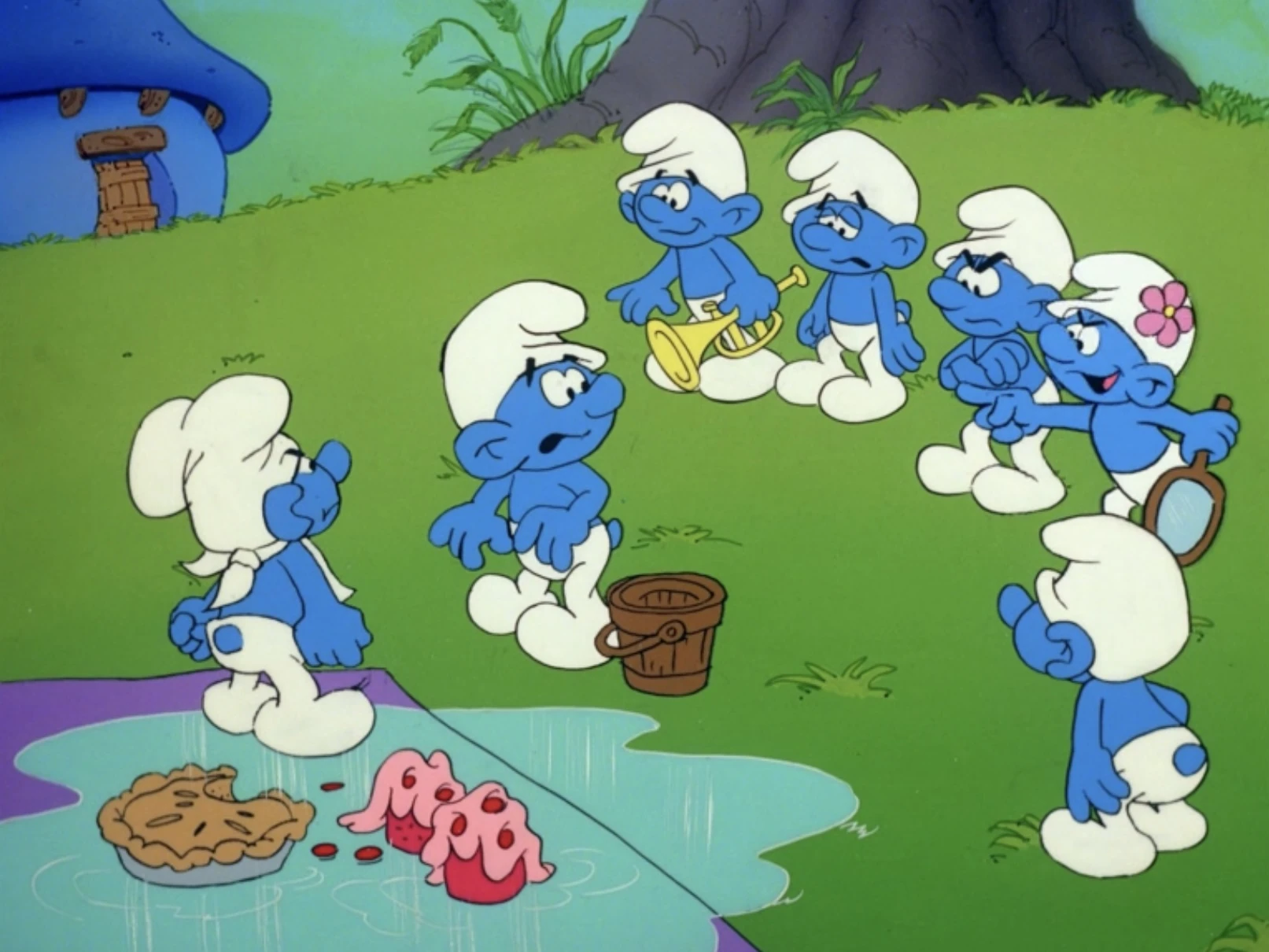 And so, as the challenge begins, Vanity hands over all his mirrors to Papa Smurf, asking him to not give him anything to look at for the next 24 hours. However, Jokey decides to have a little fun seeing if his fellow Smurfs are living up to the challenge. He sneaks up on Grouchy to see if he is scowling, but Grouchy's frown turns upside down just before Jokey tries to catch him in the act. He sees Lazy trying to keep himself awake by dousing himself with pitchers of water and tries to put him to sleep by singing a lullaby, but though Lazy manages to keep himself awake during the singing, the other Smurfs who are within earshot end up falling asleep. Then Jokey decides to tempt Greedy with a big smurfberry cake that he couldn't resist eating, but his fellow Smurfs see what Greedy is about to do and warn him about it before he even touches the cake. Greedy goes into a panic, crying out that he couldn't stand going without eating. Then Jokey tempts Vanity into looking at himself in a mirror that he shows up with, telling his friend that he looks like he's got a big wart on his nose, but Vanity is willing to prove that he can suffer not looking at himself to see if he does have a wart.