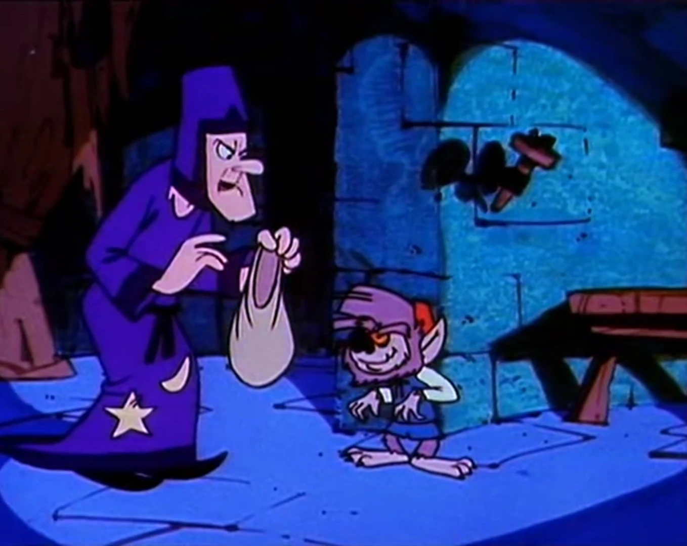 In an old castle, an evil wizard named Radna has found a book that he says holds the key to making him number one in wizardry so that his evil powers and his castle will be restored. While looking through the ingredients in the book needed for the restoration of his powers, he comes across the mention of Smurf sweat and wonders where he will ever find it or even if the Smurfs exist. But as he realizes that without the Smurfs, his power restoration will be useless, he gets a visitor in the form of Peewit, the court entertainer who is looking for someone who will offer him dinner. Radna tells the visitor to go away, but when Peewit mentions who he is and that he is a friend of the Smurfs, the evil wizard gladly receives him and serves him a dinner to satisfy his appetite. In the middle of serving the meal's courses, Radna looks through his potions and sees wolf gravy, something that will only be effective during a full moon, but he is very eager to try it out. As Radna brings forth a plate of roast beef for Peewit, he offers him gravy to pour on his meat. After eating the roast beef with the gravy, Peewit compliments Radna on the meal and insists on paying his host. Radna says that it isn't necessary, and suddenly Peewit responds with a "Yes, Master" while in a hypnotic state. Radna sees that the wolf gravy is working and tells Peewit that he will go to the Smurf Village on the night of the full moon and bring his master back three Smurfs, but until then he will forget that he has ever been with Radna.